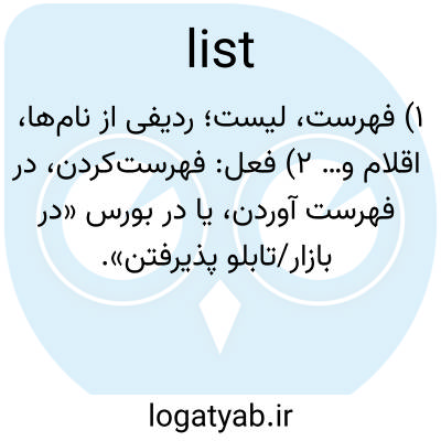 ۱) فهرست، لیست؛ ردیفی از نام‌ها، اقلام و… ۲) فعل: فهرست‌کردن، در فهرست آوردن، یا در بورس «در بازار/تابلو پذیرفتن».