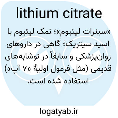 📌 یک جامد بلوری سفید که گاهی در درمان بیماری مانیک-دپرسیو و شیدایی استفاده میشود. فرمول: Li3C6H5O7
