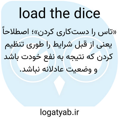 📌 دستکاری در احتمالات به گونه‌ای که شانس برنده شدن فرد دیگری کم شود؛ تقلب. برای مثال، هیچ راهی وجود ندارد که ما بتوانیم در این مسابقه برنده شویم؛ آنها تاس‌ها را بارگذاری کرده‌اند. این عبارت همچنین هنگام بارگذاری تاس‌ها استفاده می‌شود، مانند «هیچ فایده‌ای برای تلاش کردن وجود ندارد؛ تاس‌ها بارگذاری شده‌اند». این عبارت به اضافه کردن وزن به یک طرف یا طرف دیگر تاس‌ها اشاره دارد تا آنها همیشه اعداد خاصی را که رو به بالا هستند، نشان دهند. [اواخر دهه ۱۸۰۰]