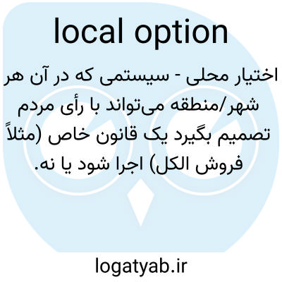 📌 حق انتخابی که توسط یک بخش سیاسی کوچک، به عنوان یک شهرستان، به ویژه در مورد اجازه فروش مشروبات الکلی اعمال میشود.