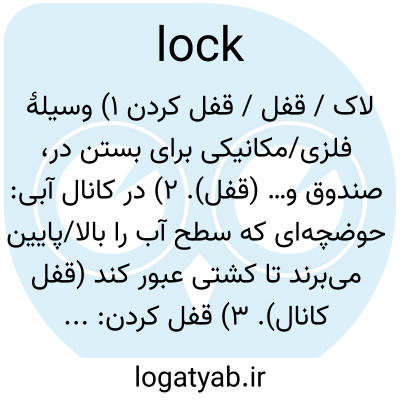 لاک / قفل / قفل کردن ۱) وسیلهٔ فلزی/مکانیکی برای بستن در، صندوق و… (قفل). ۲) در کانال آبی: حوضچه‌ای که سطح آب را بالا/پایین می‌برند تا کشتی عبور کند (قفل کانال). ۳) قفل کردن: بستن (در)، قفل شدن، گیر کردن. ۴) دسته‌موی کوچک (a lock of hair).