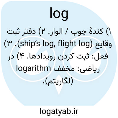 ۱) کندهٔ چوب / الوار. ۲) دفتر ثبت وقایع (ship’s log, flight log). ۳) فعل: ثبت کردن رویدادها. ۴) در ریاضی: مخفف logarithm (لگاریتم).