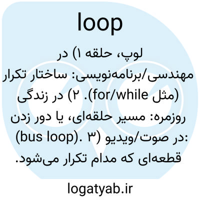 لوپ، حلقه ۱) در مهندسی/برنامه‌نویسی: ساختار تکرار (مثل for/while). ۲) در زندگی روزمره: مسیر حلقه‌ای، یا دور زدن (bus loop). ۳) در صوت/ویدیو: قطعه‌ای که مدام تکرار می‌شود.