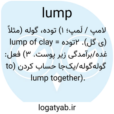 لامپ / لَمپ؛ ۱) توده، گوله (مثلاً lump of clay = توده‌ی گل). ۲) غده/برآمدگی زیر پوست. ۳) فعل: گوله‌گوله/یک‌جا حساب کردن (to lump together).