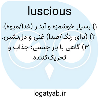 ۱) بسیار خوشمزه و آبدار (غذا/میوه). ۲) (برای رنگ/صدا) غنی و دل‌نشین. ۳) گاهی با بار جنسی: جذاب و تحریک‌کننده.