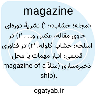 «مجله؛ خشاب»؛ ۱) نشریهٔ دوره‌ای حاوی مقاله، عکس و… . 2) در اسلحه: خشاب گلوله. 3) در فناوری قدیمی: انبار مهمات یا محل ذخیره‌سازی (مثلاً magazine of a ship).