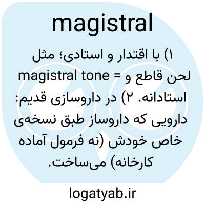 ۱) با اقتدار و استادی؛ مثل magistral tone = لحن قاطع و استادانه. ۲) در داروسازی قدیم: دارویی که داروساز طبق نسخه‌ی خاص خودش (نه فرمول آماده کارخانه) می‌ساخت.