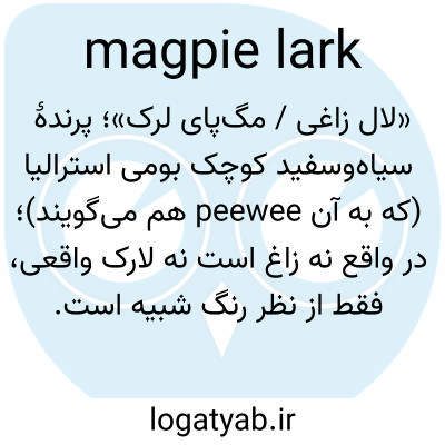 «لال زاغی / مگ‌پای لرک»؛ پرندهٔ سیاه‌وسفید کوچک بومی استرالیا (که به آن peewee هم می‌گویند)؛ در واقع نه زاغ است نه لارک واقعی، فقط از نظر رنگ شبیه است.