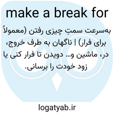 📌 همچنین، فرار کن. به سمت چیزی بدو. برای مثال، به محض اینکه تمام شد، آنها به سمت در فرار کردند، یا من باید به سمت هواپیما فرار کنم. اسم break در اینجا به معنای «فرار» است و هر دو اصطلاح را می‌توان به صورت «فرار کردن یا سریع دور شدن» به کار برد. برای مثال، با نگهبانان خواب، او تصمیم گرفت فرار کند، یا باران بند آمده است؛ بیایید فرار کنیم. [حدود ۱۸۴۰]