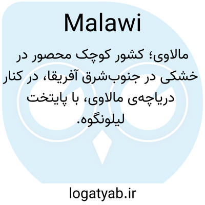 📌 سابقاً نیاسالند. جمهوری در جنوب شرقی آفریقا، در سواحل غربی و جنوبی دریاچه مالاوی: قبلاً تحتالحمایه بریتانیا و بخشی از فدراسیون رودزیا و نیاسالند بود؛ در ۶ ژوئیه ۱۹۶۴ استقلال یافت؛ عضوی از کشورهای مشترکالمنافع. ۴۹۱۷۷ مایل مربع (۱۲۷۳۶۸ کیلومتر مربع). لیلونگوه.