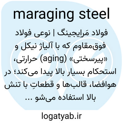 فولاد مَراِیجینگ | نوعی فولاد فوق‌مقاوم که با آلیاژ نیکل و «پیرسختی» (aging) حرارتی، استحکام بسیار بالا پیدا می‌کند؛ در هوافضا، قالب‌ها و قطعاتِ با تنش بالا استفاده می‌شود.