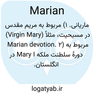 ماریانی. ۱) مربوط به مریم مقدس (Virgin Mary) در مسیحیت، مثلاً Marian devotion. ۲) مربوط به دورهٔ سلطنت ملکه Mary I در انگلستان.