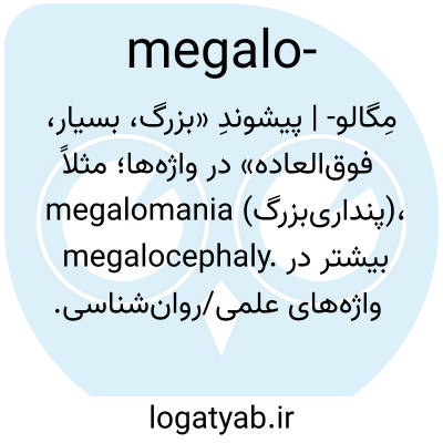 مِگالو- | پیشوندِ «بزرگ، بسیار، فوق‌العاده» در واژه‌ها؛ مثلاً megalomania (بزرگ‌پنداری)، megalocephaly. بیشتر در واژه‌های علمی/روان‌شناسی.