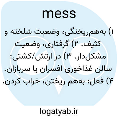 ۱) به‌هم‌ریختگی، وضعیت شلخته و کثیف. ۲) گرفتاری، وضعیت مشکل‌دار. ۳) در ارتش/کشتی: سالن غذاخوری افسران یا سربازان. ۴) فعل: به‌هم ریختن، خراب کردن.
