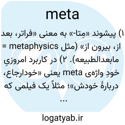 ۱) پیشوند «مِتا-» به معنی «فراتر، بعد از، بیرون از» (مثل metaphysics = مابعدالطبیعه). ۲) در کاربرد امروزیِ خودِ واژه‌ی meta یعنی «خودارجاع، دربارهٔ خودش»؛ مثلاً یک فیلمی که درباره ساختنِ همان فیلم است، می‌گویند خیلی meta است.