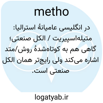 در انگلیسی عامیانهٔ استرالیا: متیله‌اسپیریت / الکل صنعتی؛ گاهی هم به کوتاه‌شدهٔ روش/متد اشاره می‌کند ولی رایج‌تر همان الکل صنعتی است.