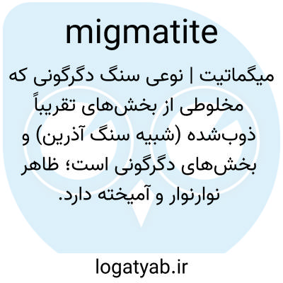 📌 سنگی با منشأ دگرگونی و آذرین که ویژگیهای هر دو نوع سنگ را نشان میدهد. میگماتیتها احتمالاً از طریق گرم شدن (اما نه ذوب شدن) سنگها در حضور سیالات فراوان تشکیل میشوند.