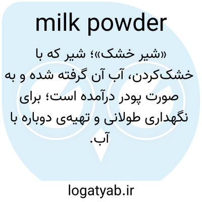 «شیر خشک»؛ شیر که با خشک‌کردن، آب آن گرفته شده و به صورت پودر درآمده است؛ برای نگهداری طولانی و تهیه‌ی دوباره با آب.