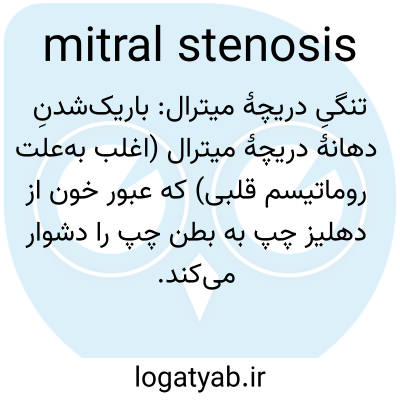 📌 تنگی غیرطبیعی دریچه میترال که معمولاً در اثر بیماریهایی مانند تب روماتیسمی ایجاد میشود و جریان آزاد خون از دهلیز به بطن را مسدود میکند.