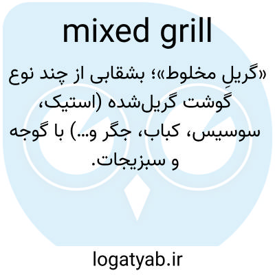 📌 مجموعهای از چندین نوع گوشت کبابی یا گریل شده، و معمولاً سبزیجات، که با هم سرو میشوند، مانند کتلت بره، سوسیس خوک، یک تکه جگر، گوجه فرنگی کبابی و قارچ.