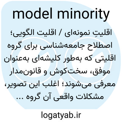 اقلیتِ نمونه‌ای / اقلیت الگویی؛ اصطلاح جامعه‌شناسی برای گروه اقلیتی که به‌طور کلیشه‌ای به‌عنوان موفق، سخت‌کوش و قانون‌مدار معرفی می‌شوند؛ اغلب این تصویر، مشکلات واقعی آن گروه را پنهان می‌کند.