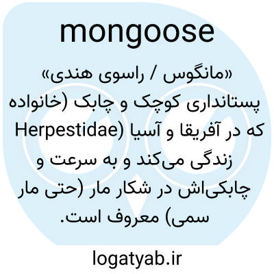 📌 گوشتخواری باریک و راسو مانند، Herpestes edwardsi، بومی هند، که از جوندگان، پرندگان و تخم آنها تغذیه می‌کند و به ویژه به خاطر توانایی‌اش در کشتن کبرا و سایر مارهای سمی شناخته شده است.