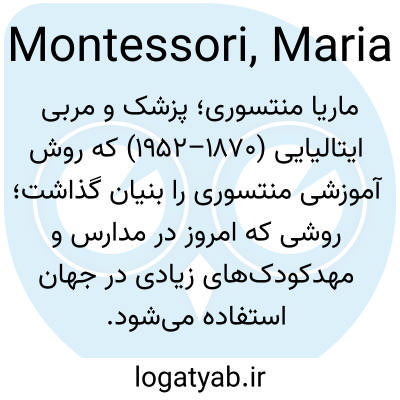 📌 یک مربی ایتالیایی قرن بیستم. مدارس مونتسوری بر اساس ایده‌های آموزشی او بنا شده‌اند که بر رشد میل ذاتی کودک به خلاقیت و موفقیت تأکید دارد. بیشتر آموزش‌های مونتسوری در پیش‌دبستانی و مهدکودک انجام می‌شود.