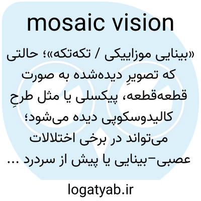 «بینایی موزاییکی / تکه‌تکه»؛ حالتی که تصویرِ دیده‌شده به صورت قطعه‌قطعه، پیکسلی یا مثل طرحِ کالیدوسکوپی دیده می‌شود؛ می‌تواند در برخی اختلالات عصبی–بینایی یا پیش از سردرد میگرنی رخ دهد.