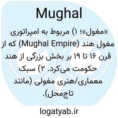«مغول»؛ ۱) مربوط به امپراتوری مغول هند (Mughal Empire) که از قرن ۱۶ تا ۱۹ بر بخش بزرگی از هند حکومت می‌کرد. ۲) سبک معماری/هنری مغولی (مانند تاج‌محل).