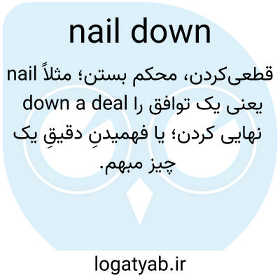 قطعی‌کردن، محکم بستن؛ مثلاً nail down a deal یعنی یک توافق را نهایی کردن؛ یا فهمیدنِ دقیقِ یک چیز مبهم.