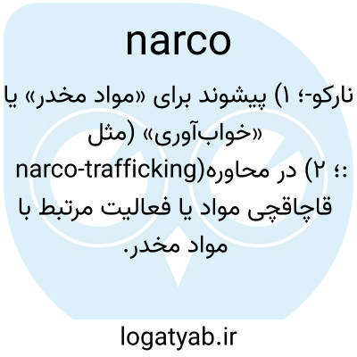 نارکو-؛ ۱) پیشوند برای «مواد مخدر» یا «خواب‌آوری» (مثل narco-trafficking)؛ ۲) در محاوره: قاچاقچی مواد یا فعالیت مرتبط با مواد مخدر.