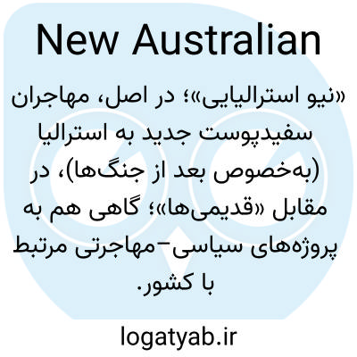 «نیو استرالیایی»؛ در اصل، مهاجران سفیدپوست جدید به استرالیا (به‌خصوص بعد از جنگ‌ها)، در مقابل «قدیمی‌ها»؛ گاهی هم به پروژه‌های سیاسی–مهاجرتی مرتبط با کشور.