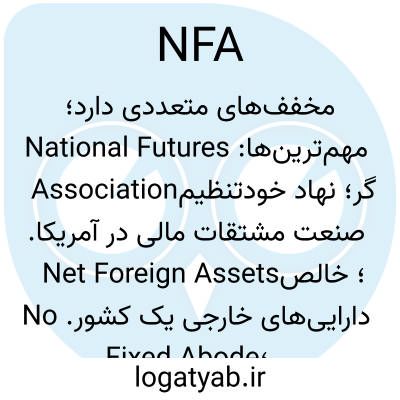 مخفف‌های متعددی دارد؛ مهم‌ترین‌ها: National Futures Association؛ نهاد خودتنظیم‌گر صنعت مشتقات مالی در آمریکا. Net Foreign Assets؛ خالص دارایی‌های خارجی یک کشور. No Fixed Abode؛ «فاقد محل سکونت ثابت» (در بریتانیا). در اسلنگ مالی آنلاین: Not Financial Advice = «مشاوره‌ی مالی نیست».