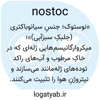 «نوستوک؛ جنسِ سیانوباکتری (جلبکِ سبزآبی)»؛ میکروارگانیسم‌هایی ژله‌ای که در خاکِ مرطوب و آب‌های راکد توده‌های ژله‌مانند می‌سازند و نیتروژنِ هوا را تثبیت می‌کنند.