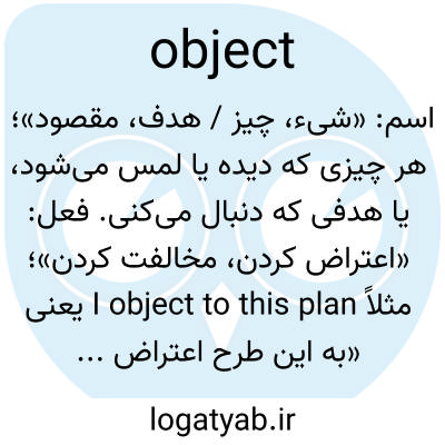 اسم: «شیء، چیز / هدف، مقصود»؛ هر چیزی که دیده یا لمس می‌شود، یا هدفی که دنبال می‌کنی. فعل: «اعتراض کردن، مخالفت کردن»؛ مثلاً I object to this plan یعنی «به این طرح اعتراض دارم».