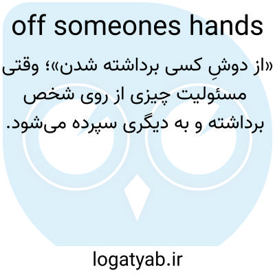 📌 خارج از مسئولیت، تصرف یا مالکیت کسی. اغلب به صورت «دست کسی را بردار» استفاده میشود، مانند «امیدواریم وقتی بچه گربهها را دیدند، آنها را از دست ما بگیرند»، یا «خوشحالم که بالاخره تاب از دستمان رفت». [نیمه اول دهه ۱۶۰۰]