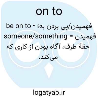 فهمیدن/پی بردن به؛ • be on to someone/something = فهمیدن حقهٔ طرف، آگاه بودن از کاری که می‌کند.
