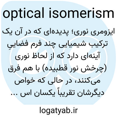 📌 استریوایزومریسمی که در آن ایزومرها از نظر وزن مولکولی و بیشتر خواص شیمیایی و فیزیکی یکسان هستند اما از نظر تأثیر بر چرخش نور قطبیده متفاوتند.
