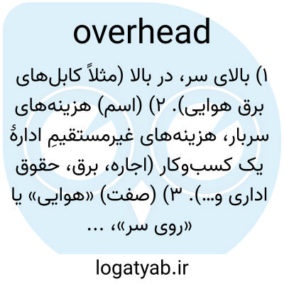 ۱) بالای سر، در بالا (مثلاً کابل‌های برق هوایی). ۲) (اسم) هزینه‌های سربار، هزینه‌های غیرمستقیمِ ادارهٔ یک کسب‌وکار (اجاره، برق، حقوق اداری و…). ۳) (صفت) «هوایی» یا «روی سر»، مثل خط آهن هوایی یا جرثقیل سقفی.