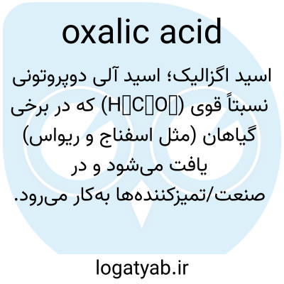 📌 اسید سفید، بلوری، محلول در آب و سمی، H2C2O4⋅2H2O، که ابتدا در شیره گونههای ترشک چوبی از جنس oxalis کشف شد و از واکنش مونوکسید کربن با هیدروکسید سدیم یا برخی کربوهیدراتها با اسیدها یا قلیاها به دست میآید: عمدتاً برای سفید کردن، به عنوان پاککننده و به عنوان یک معرف آزمایشگاهی استفاده میشود.