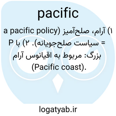 ۱) آرام، صلح‌آمیز (a pacific policy = سیاست صلح‌جویانه). ۲) با P بزرگ: مربوط به اقیانوس آرام (Pacific coast).