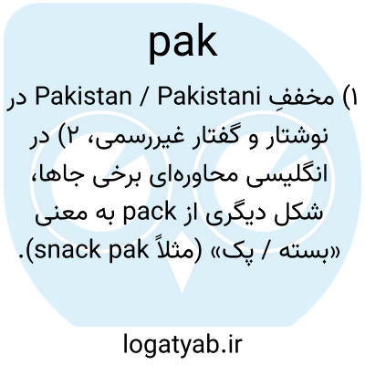 ۱) مخففِ Pakistan / Pakistani در نوشتار و گفتار غیررسمی، ۲) در انگلیسی محاوره‌ای برخی جاها، شکل دیگری از pack به معنی «بسته / پک» (مثلاً snack pak).