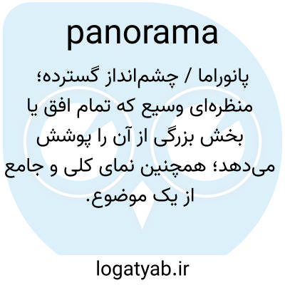 📌 نمایش بصریِ افقیِ گسترده که نمای وسیعی از یک منظره یا صحنهی دیگر را ارائه میدهد، در عکاسی با اتصال مجموعهای از نماها یا با استفاده از لنز زاویه باز، و در فیلم با چرخاندن افقی دوربین از یک مکان ثابت.