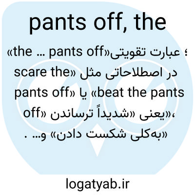 📌 این عبارت برای تشدید معنای افعالی مانند «That speech had bored us» یا «It was a real tornado and feared pants off me» استفاده میشود. نمایشنامهنویس یوجین اونیل در نمایشنامه «Ah, Wilderness!» (1933) از آن استفاده کرد: «بهت میگم، تو شلوارش رو ترسوندی» و اولین وو در نمایشنامه «A Handuff of Dust» (1934) نوعی دیگر از آن را ارائه داد: «She had bore my pants off». [محاورهای؛ اوایل دهه 1900] همچنین رجوع کنید به «bear to death; beat the pants off».