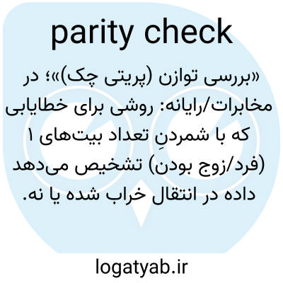📌 روشی برای تشخیص خطاها در ارتباطات داده یا درون یک سیستم کامپیوتری با شمارش تعداد یکها یا صفرها در هر بایت یا در هر کلمه، شامل یک بیت بررسی ویژه (بیت توازن)، برای تشخیص زوج یا فرد بودن مقدار.
