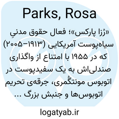 «رُزا پارکس»؛ فعال حقوق مدنیِ سیاه‌پوست آمریکایی (۱۹۱۳–۲۰۰۵) که در ۱۹۵۵ با امتناع از واگذاری صندلی‌اش به یک سفیدپوست در اتوبوس مونتگُمری، جرقه‌ی تحریم اتوبوس‌ها و جنبش بزرگ حقوق مدنی را زد؛ به او «مادر جنبش حقوق مدنی» می‌گویند.
