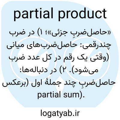 «حاصل‌ضربِ جزئی»؛ ۱) در ضرب چندرقمی: حاصل‌ضرب‌های میانی (وقتی یک رقم در کل عدد ضرب می‌شود). ۲) در دنباله‌ها: حاصل‌ضربِ چند جملهٔ اول (برعکس partial sum).