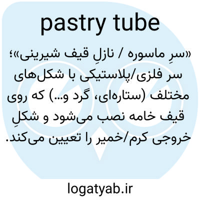 📌 لولهای مخروطی شکل با سوراخی طرحدار در یک سر، که روی دهانه قیف شیرینیپزی پارچهای قرار میگیرد، برای شکل دادن به آیسینگها، خمیرهای غذایی و غیره، زیرا با فشار دادن کیسه از آن عبور میکنند.