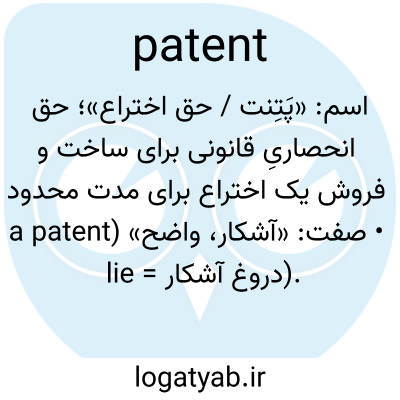اسم: «پَتِنت / حق اختراع»؛ حق انحصاریِ قانونی برای ساخت و فروش یک اختراع برای مدت محدود • صفت: «آشکار، واضح» (a patent lie = دروغ آشکار).