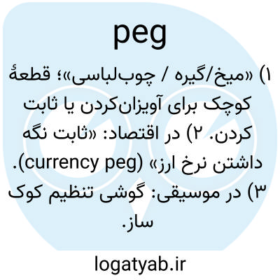 ۱) «میخ/گیره / چوب‌لباسی»؛ قطعهٔ کوچک برای آویزان‌کردن یا ثابت کردن. ۲) در اقتصاد: «ثابت نگه داشتن نرخ ارز» (currency peg). ۳) در موسیقی: گوشی تنظیم کوک ساز.
